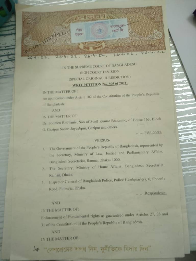 On January 11, 2021, a) Dr. Soumen Bhowmic, a human rights activist in Bangladesh and UK, b) Tasmiah Nuhiya Ahmed, an Advocate and human rights activist in Bangladesh and c) Dr. S. M. Siddique Hossain, Director of Empowerment through Law of the Common People (ELCOP), collectively filed a Writ Petition of number 505 of 2021 with the High Court Division of Bangladesh Supreme Court. This is a public interest litigation and is now with Annex Court 35. You can view a PDF of the certified copy of the petition towards the bottom of this page.