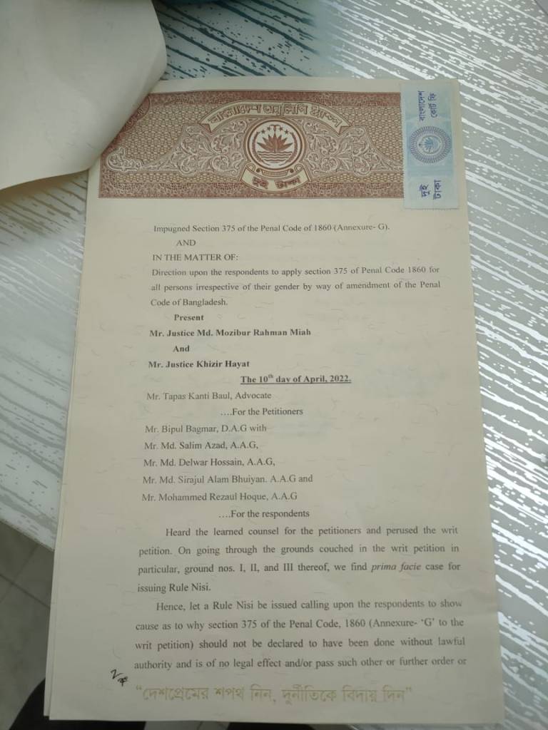 এই আবেদনটি বাংলাদেশের জন্য অত্যন্ত গুরুত্বপূর্ণ যেহেতু যে কোনও মানুষ দ্বারা (অধিকাংশ ক্ষেত্রেই পুরুষ) যৌন আক্রমণের শিকার কোনও পুরুষ বা রূপান্তরকামীর জন্য আইনি প্রতিকারের কোনও ব্যবস্থাই নেই।
