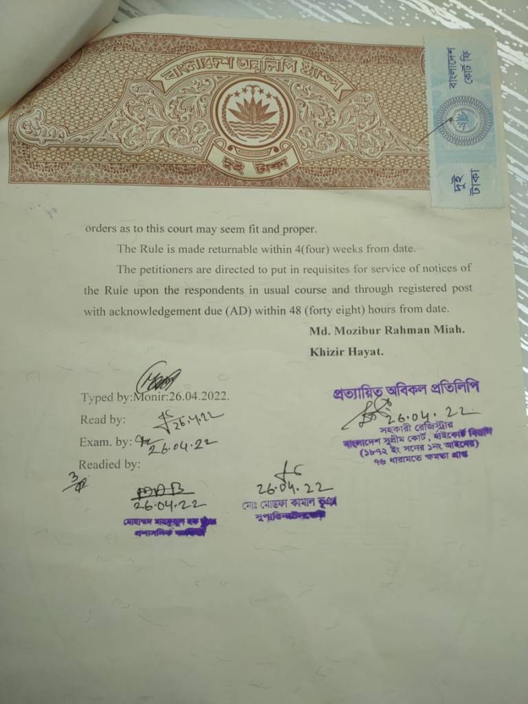 Dr. Soumen Bhowmic has spent a considerable part of his fortune to bring us this initial victory. In addition to spending his own money, he has dedicated his personal life for this cause as well. He has obtained the written copy of the Rule Nisi attached below. Bangladesh government has 4 (four) weeks to respond from the date of this written copy which is April 26, 2022.